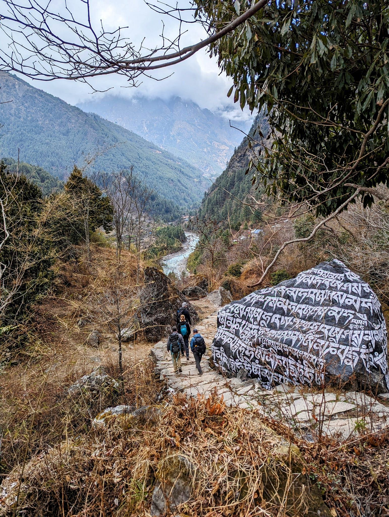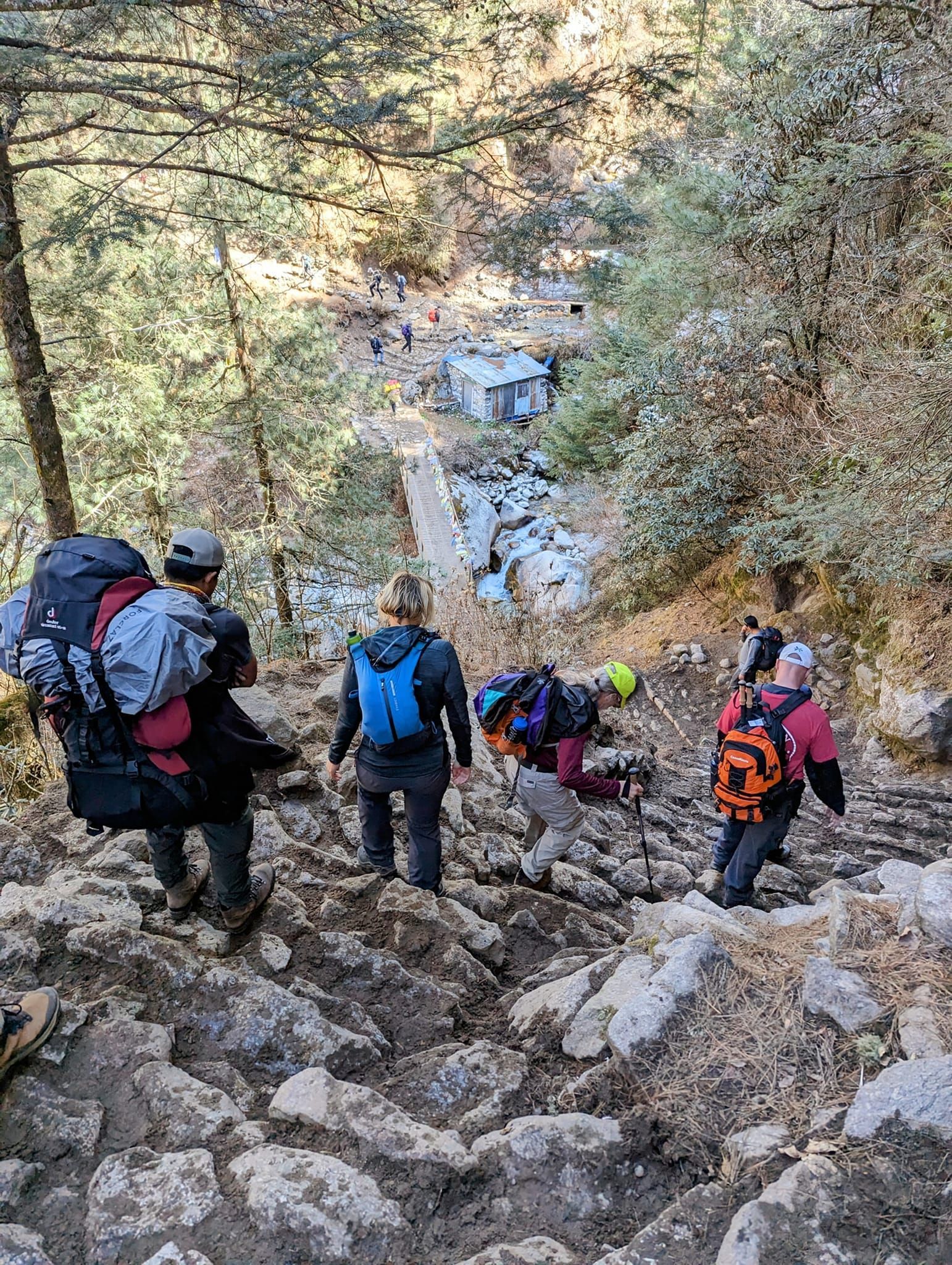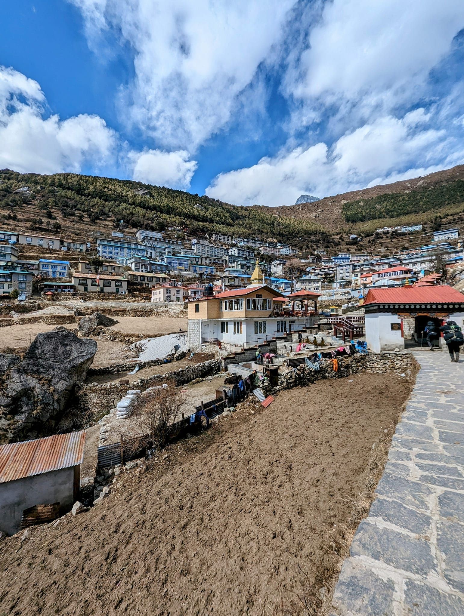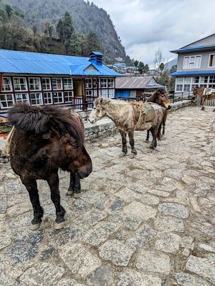 Despite the freezing room, equipped with a trusty hot water bottle, we started with a hearty breakfast before tackling a challenging uphill trek. Lunch at Bishal Restaurant featured mushroom pizza and chips. Amidst encounters with donkeys and swing bridges, we arrived at Namche, indulging in mac n cheese and apple pie for dinner.
