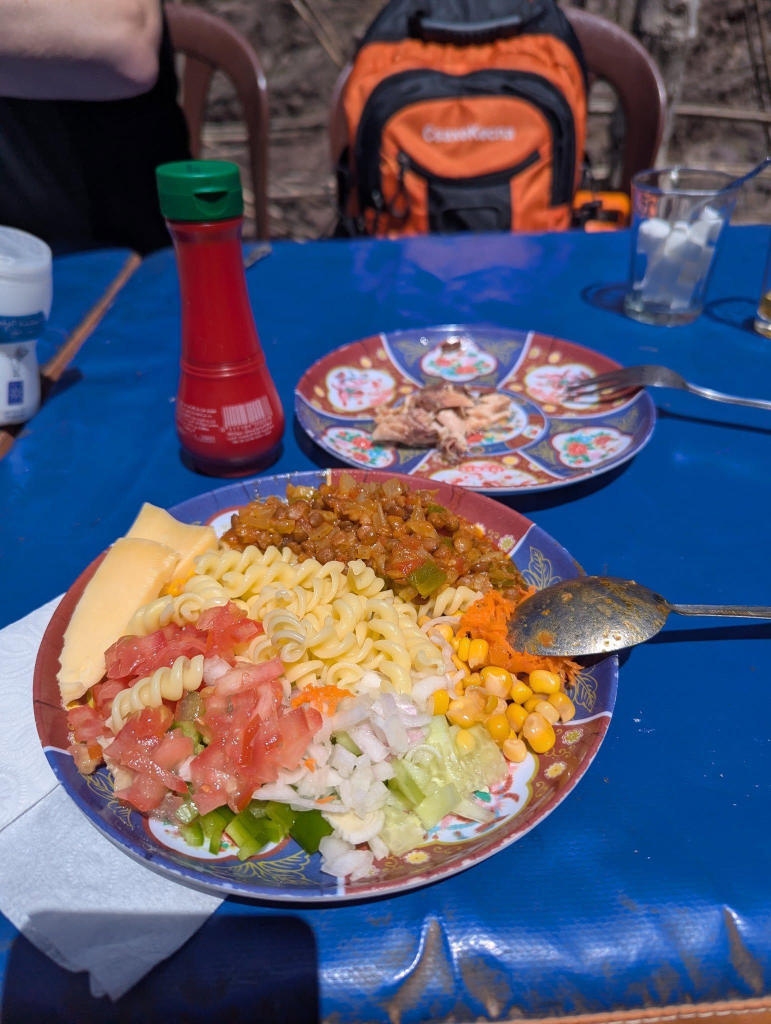 We kicked off with a steady climb, broken up by a lunch stop that reminded me how good the basics can be in the mountain. Pasta, fresh salad, lentils, bread.